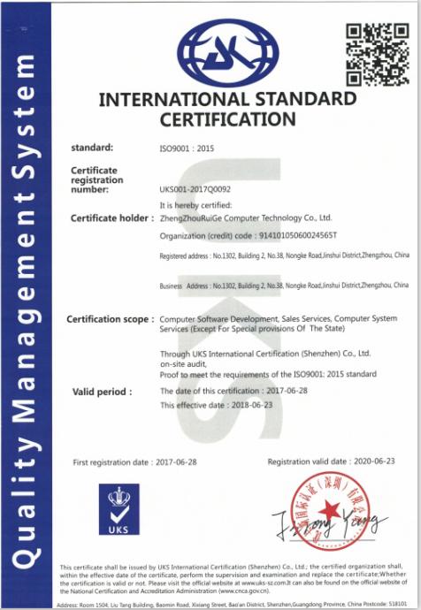 热烈祝贺郑州睿格计算机科技有限公司通过ISO9001国际质量体系认证,公司将严格遵循软件开发流程,严控产品质量,特别是社会网格化管理、综合执法、软件定制开发等领域,争做国内领先水平,更好的客户服务。