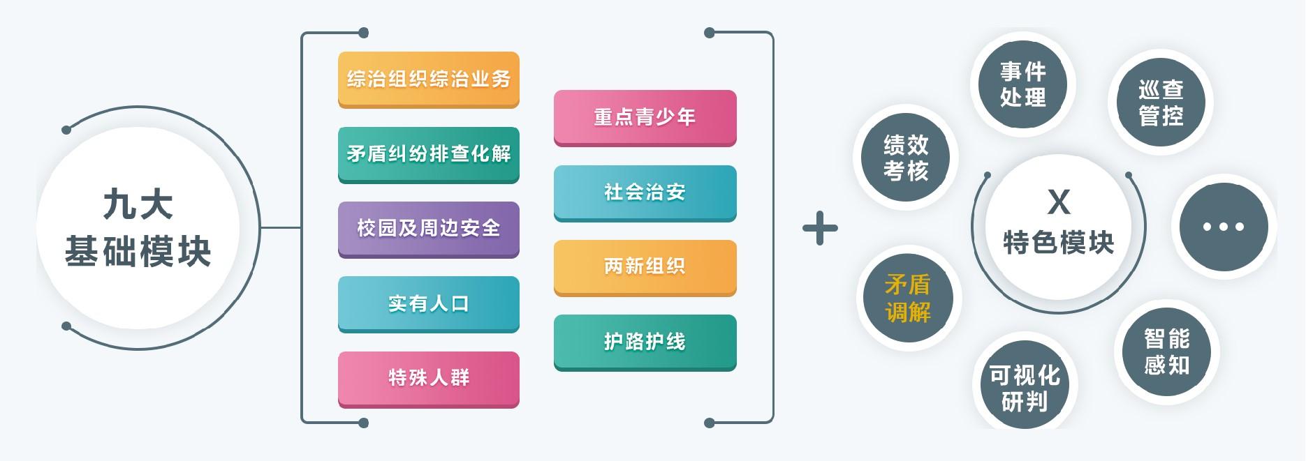 依据国家综治“九+X”《社会治安综合治理基础数据规范》(GB/T 31000—2015)标准,采用九大基础模块+X项特色模块。